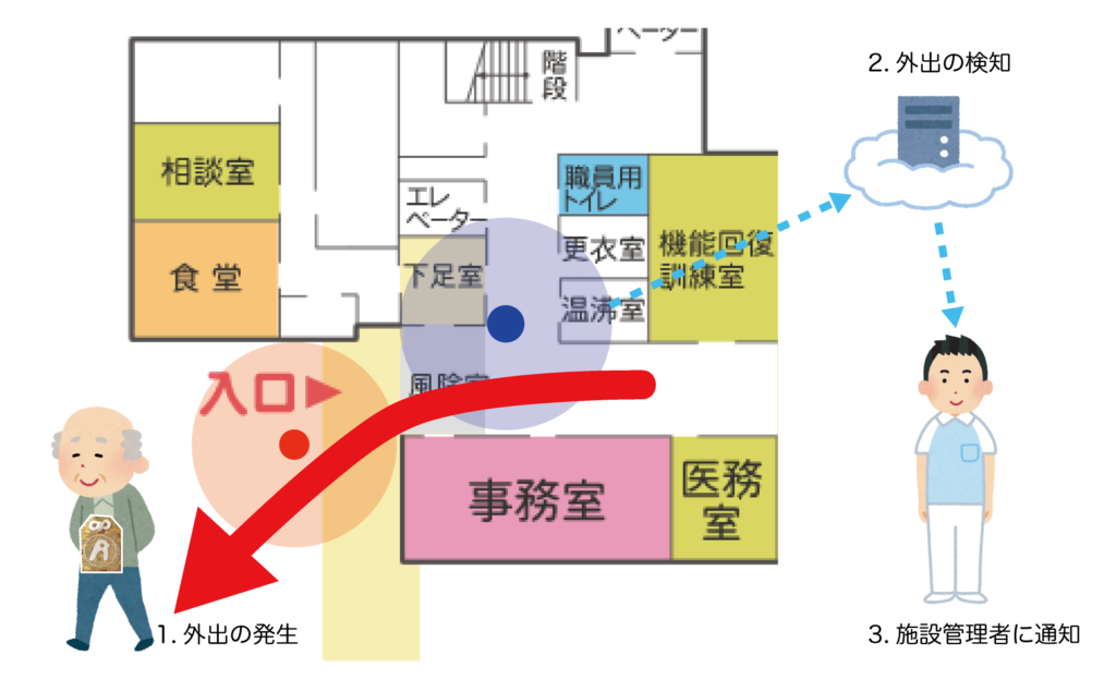 玄関、屋上など、その場所から出たことを通知したい場所に固定検知端末を設置すると、 施設からの外出、施設への帰宅を検知し、施設管理者に通知します。 外出の通知がすぐに届くことにより、徘徊を未然に防ぐことが可能です。