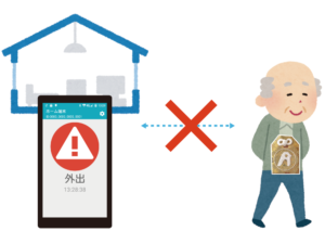 ビーコンの電波を固定検知端末が受信できなくなると、外出状態の判定を行います。画面表示やアラーム音によっておしらせします。